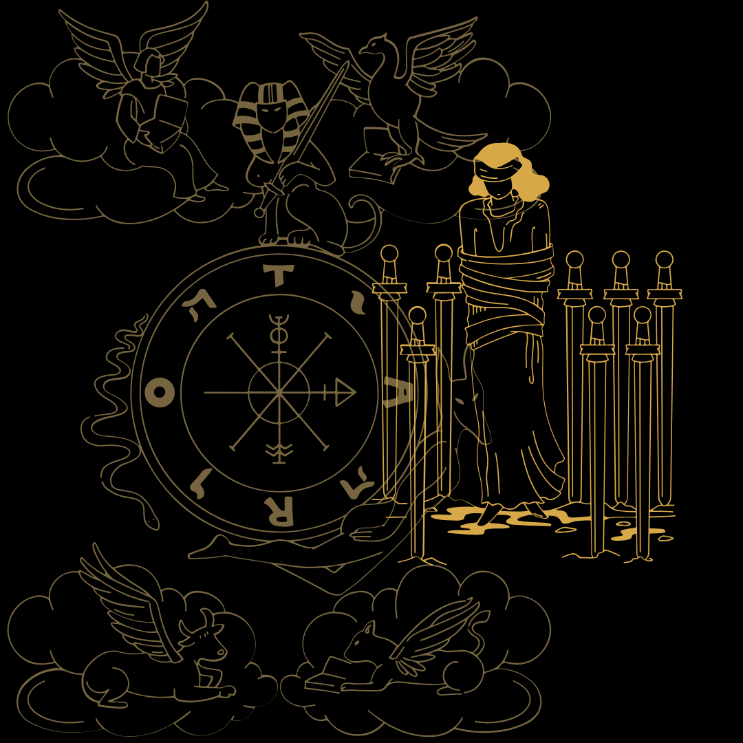 The decan’s minor is 8 of Swords, with the imagery of a woman standing blinded and bound, with her feet in the river and eight swords beside her dug into the sand. Paralyzed by the wealth of possibilities, we may find ourselves unable to choose a single direction, and so we release willful determination to